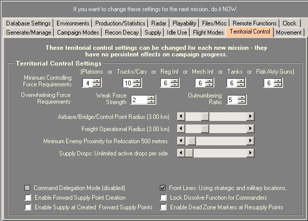 To achieve this result, SEOW now supports two new campaign settings parameters under the "Overwhelming Force Requirements" heading: Weak_Force and Overwhelming_Force_Ratio. These parameters can be adjusted by the administrator using the Territorial Control tab in the SEDCS. This allows the campaign administrator to determine the smallest scale battle that is automatically resolved by SEOW without the need for direct ground planning by commanders.