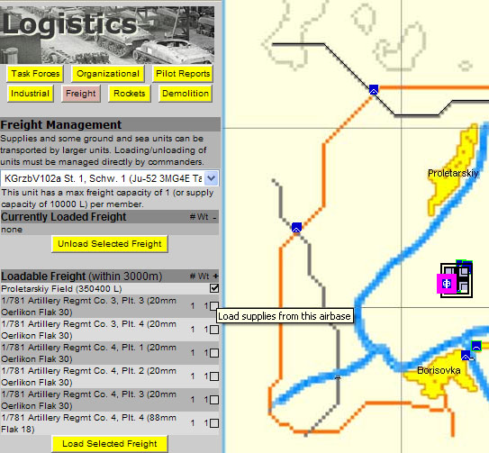 Commander will necessarily become proficient at moving supplies around their maps. The alternative is unthinkable. Let's look at air freight of supplies first. Use the Logistics:Freight Tool (see below). Select your air transport flight, e.g. a Ju-52. Select the local airbase fuel supply and hit "Load Selected Freight". Choose the amount of fuel you want to load and then hit OK.
