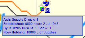 When your map is refreshed, your fuel load will be reflected in your air transport flight tooltip. You can now task your air transport to either fly the supplies to another airbase, where it can be unloaded to the new airbase fuel reserves, or you can order the transport flight to perform a Supply Drop anywhere on the map. This is done similarly to issuing a GATTACK waypoint - instead of selecting "G" as the waypoint directive, use "S" (available only for freight aircraft). If the air transport makes it to the supply drop location, the drop is assumed to be successful and a Supply Drop icon will appear on the map, as shown below:
