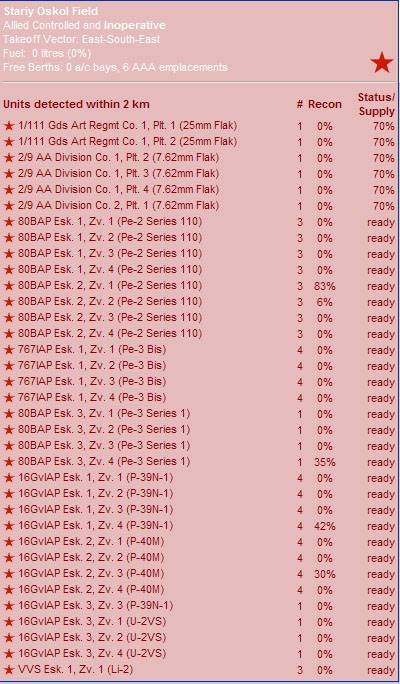 As mentioned earlier, aircraft will take fuel from airbase reserves (or off map reserves if the flights are based off map) according to the fuel load specified by the flight commander. If Enforce_Aircraft_Loadouts is OFF, human pilots may choose their own fuel load at hosting time. SEOW will capture the fuel load actually used by pilots and decrement the airbase reserves accordingly. Droptank loads are also detected. If your airbase runs out of fuel, the airbase tooltip header will turn white, and ALL flights at that base will be grounded until new supplies arrive, either by air or ground. Here is a picture of an airbase out of supply: