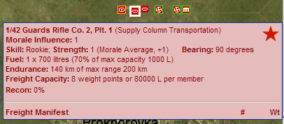 We can see that it has a Morale Influence rating of +1, which means that it adds +1 to every nearby friendly unit's morale at the end of each mission. It is also carrying 70% of its own supply needs. As a transportation unit it can carry up to 8 transportation points or up to 80000 litres of fuel supply. Presently it is transporting no freight at all.