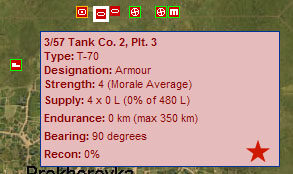 Clearly this platoon is out of fuel, is immobilized and will need 4x480 = 1920 litres to completely resupply the platoon. Thankfully, its morale is still Average, so it will be at least 2 more missions before the T-70 platoon has a chance of deserting.