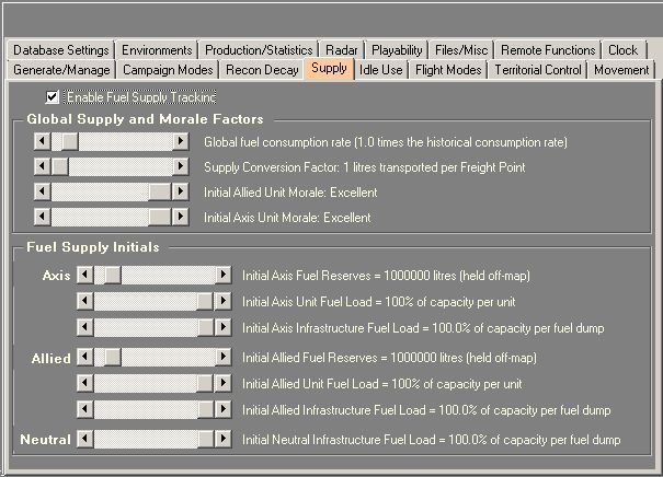 Underneath that is the "Fuel Supply Initials" panel. This panel contains settings that are used to specify the initial supply holdings in all units and facilities on the map, for each side. For each side there is a "Fuel Reserves" slider which determines the initial volume of supply held offmap for each side. These reserves can be transported onto the map using freight transportation units (ships, vehicles, aircraft) according to their individual freight capacities. Players cannot "buy" more fuel reserves! Then there is a slider for Initial Unit Fuel Load, a percentage value which is applied to each unit's maximum fuel capacity to determine the initial fuel holding in litres for each unit. Template initialization can lead to industrial installations being controlled by either side, or left as neutral. Sliders are provided for determining the initial Infrastructure Fuel Load of fuel installations, based on the maximum capacity multiplied by the slider percentages. The same sliders are used to determine initial airbase fuel holdings according to initial national control.