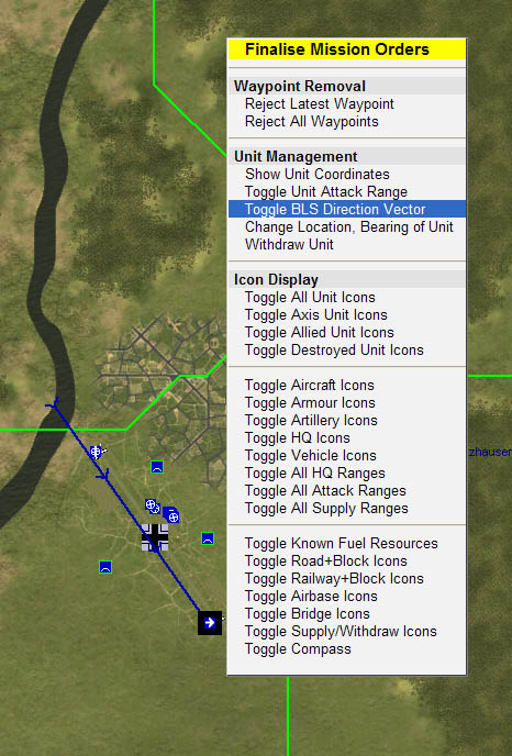 The BLS objects need to be positioned directly by commanders as they are NOT managed by SEOW. In your campaign, BLS objects are platoons, just like all other platoons. They can be targeted and destroyed by the enemy, they can be tasked to move and they can be produced in factories. Commanders must move/transport them to the airbase destination and then use CC methods to relocate and position them precisely at the end of the runway (just off to the side to avoid aircraft hitting them) and oriented so that they point right down the approach vector. There is a new MP tool that shows the BLS Direction Vector (see image below). CC ability is automatic within the control radius of any airbase. Make sure that the BLS shines at aircraft landing in the normal landing direction for that airbase. When displayed the BLS vector has arrows indicating the direction that aircraft must approach the BLS in order to hear directional codes.