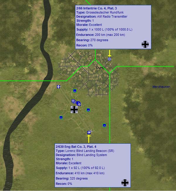 Here is a screenshot from MP4public v4.756 showing deployments of a Grossdeutscher Rundfunk AM transmitter at Ouren (Ardennes sector), plus a Lorenz Short Range BLS at Merzhausen Field. These objects are assigned army affiliations by SEOW (not air regiments).