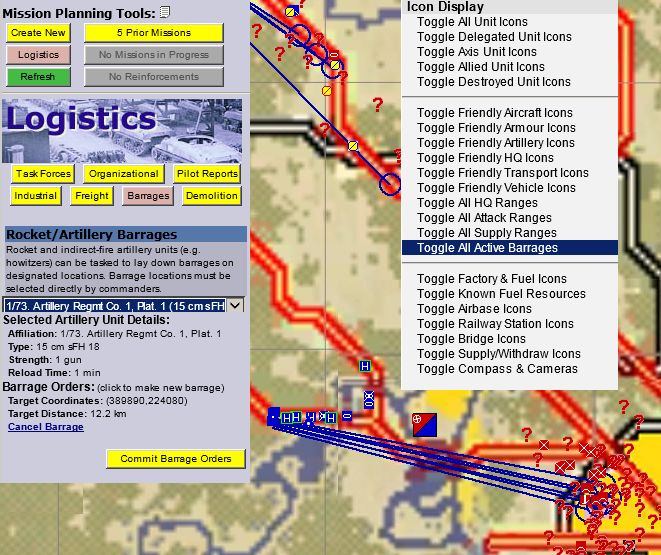 The commander simply uses the Logistics:Barrages tool in the MP to select friendly barrage-capable units and issue map coordinates for the artillery unit to shoot at, by clicking on the map. The MP Barrage interface is an evolution of the Rocket interface - both rockets and artillery are handled by the one tool, so howitzers, katyushas, V1 and V2 rockets are handled in the same way now. See the original Rocket Barrages page for relevant information.