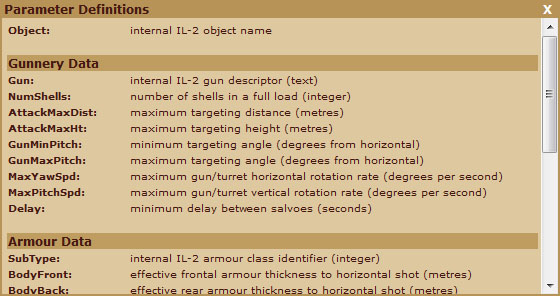 Technics files are internal game configuration files that pre-determine behaviours associated with ground objects (mobile and stationary). Parameters such as armour thickness, movement speed, shooting range and many others are found in the Technics file. The stock Technics file provided by IL-2 contains values that are reasonably sensible defaults for many common IL-2 scenarios, however there are choices inherent in the parameter values that do not make sense for some combat situations, plus there are some simple typographical errors that need to be corrected. So that means that a campaign designer may wish to tweak values to suit the intended campaign design. For example, a campaign that features street fighting may wish to reduce armour shooting ranges to make infantry relatively more effective. Or, for a campaign run on good roads in summer time, the designer may wish to increase speeds of some vehicles to give them a comparative advantage.