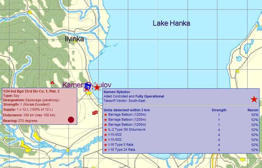 Here is a graphical example of conventional SEOW spy placement to support an armoured assault. The Japanese forces have placed a spy west of Kamen Rybolov in the Lake Hanka region of the Manchuria sector. Over time the spy has collected 52% recon on the local Soviet controlled airbases, showing that there is no serious ground defence (only some barrage balloons). The base should be easy to capture if the approaching Japanese tanks to the south can move swiftly and destroy the balloon units before the enemy IL-2s can intervene. Twenty enemy aircraft could be captured!