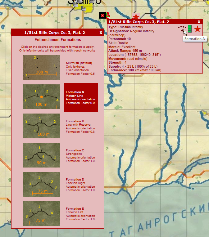 The available formations are shown in the image below (Formation Selector window, left). This window can be displayed in the Mission Planner by clicking the Formation indicator graphic in the unit tooltip (below right). In this case the infantry unit is in Formation A (Platoon Line), as is indicated in the unit tooltip graphic and by the red highlighting in the Formation Selector window.